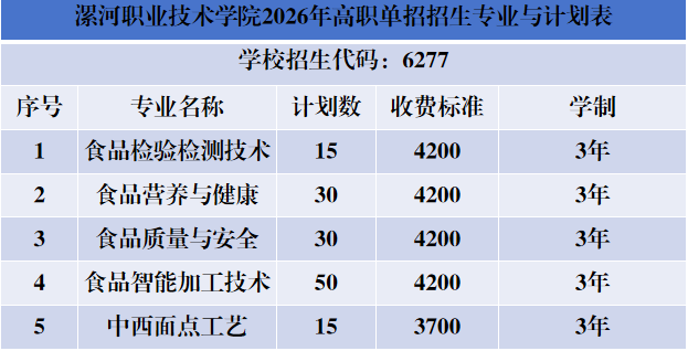 漯河职业技术学院食品技术创新学院2026年高职单招招生专业与计划表