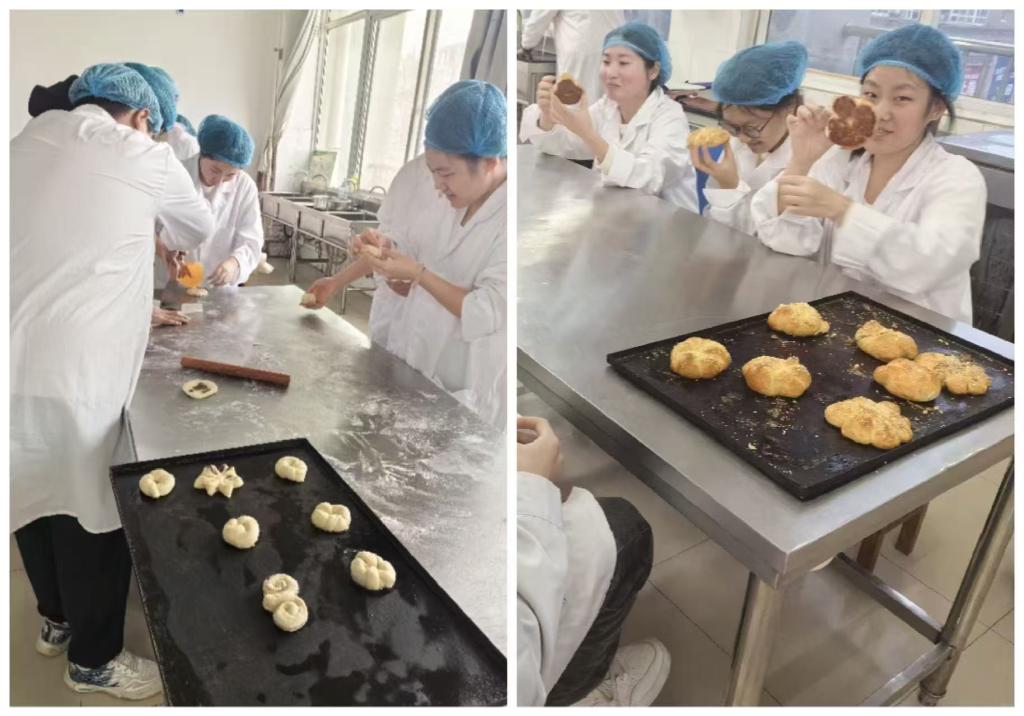 在“创意面包制作”环节中,学院为同学们准备了面粉、酵母、黄油、奶粉等食材及专业工具,同学们自由组队,分工协作,揉制面团、搭配食材、装饰成品,在称量、塑形的互动中分享生活趣事,在创意碰撞中化解学业压力。