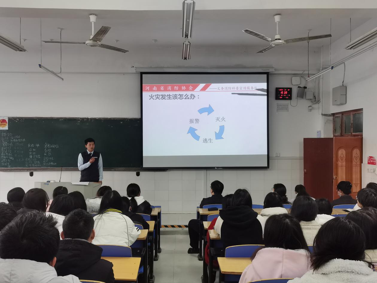 本次活动特别邀请了河南省消防协会义务消防科普宣传服务队薛金灿教员为大家进行讲解。薛金灿使用视频、图片、案例等多种方式向师生们生动地讲述了校园火灾的破坏力和火灾带来的严重后果,结合学校实际和常见的消防安全隐患,用通俗易懂的语言讲解了消防基础知识、火灾防范、扑救火灾方法及火场逃生要诀等内容。
