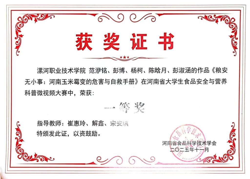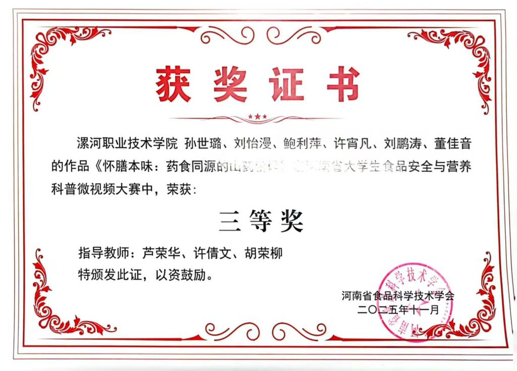 近日,河南省第二届食品安全与营养科普微视频大赛决赛在许昌学院顺利落幕。来自全省各高校的学子围绕食品安全与营养主题展开创意角逐,展现当代青年在科普宣传领域的创新活力。其中,我校食品技术创新学院报送作品5件,其中《粮食安全无小事:河南玉米霉变的危害与自救手册》和《怀膳本味:药食同源的山药密码》一举斩获大赛一等奖和三等奖两项殊荣。
