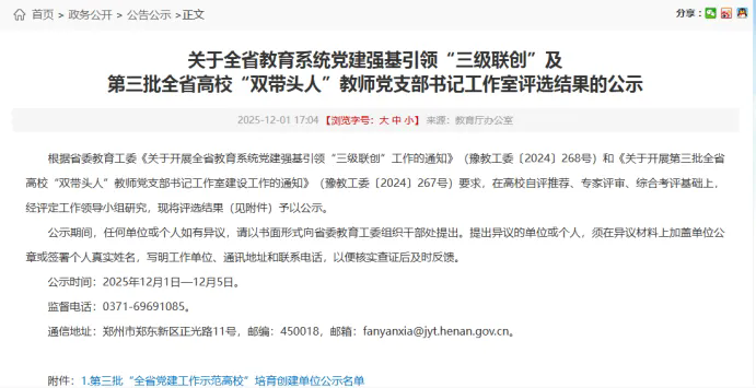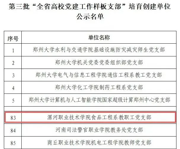 近日,中共河南省委教育工作委员会公示第三批“全省高校党建工作样板支部”培育创建单位名单,我校食品工程系教职工党支部成功入选。这是我校党建工作取得的又一重要成果,充分体现了学校基层党组织建设的扎实成效。