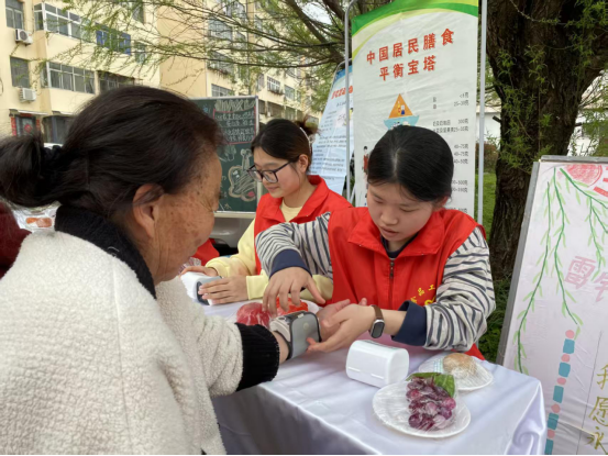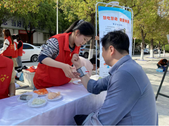 在社区服务中心,志愿者们为中老年居民免费测量血压、体重、血糖,结合食品专业知识,细致讲解“三高”防控、低盐低脂膳食调理等健康知识,用贴心服务守护长辈健康;在学院实训广场,围绕师生日常饮食、作息痛点,普及科学膳食、均衡营养知识,答疑解惑、分享实用养生技巧,营造起浓厚的健康科普氛围。
